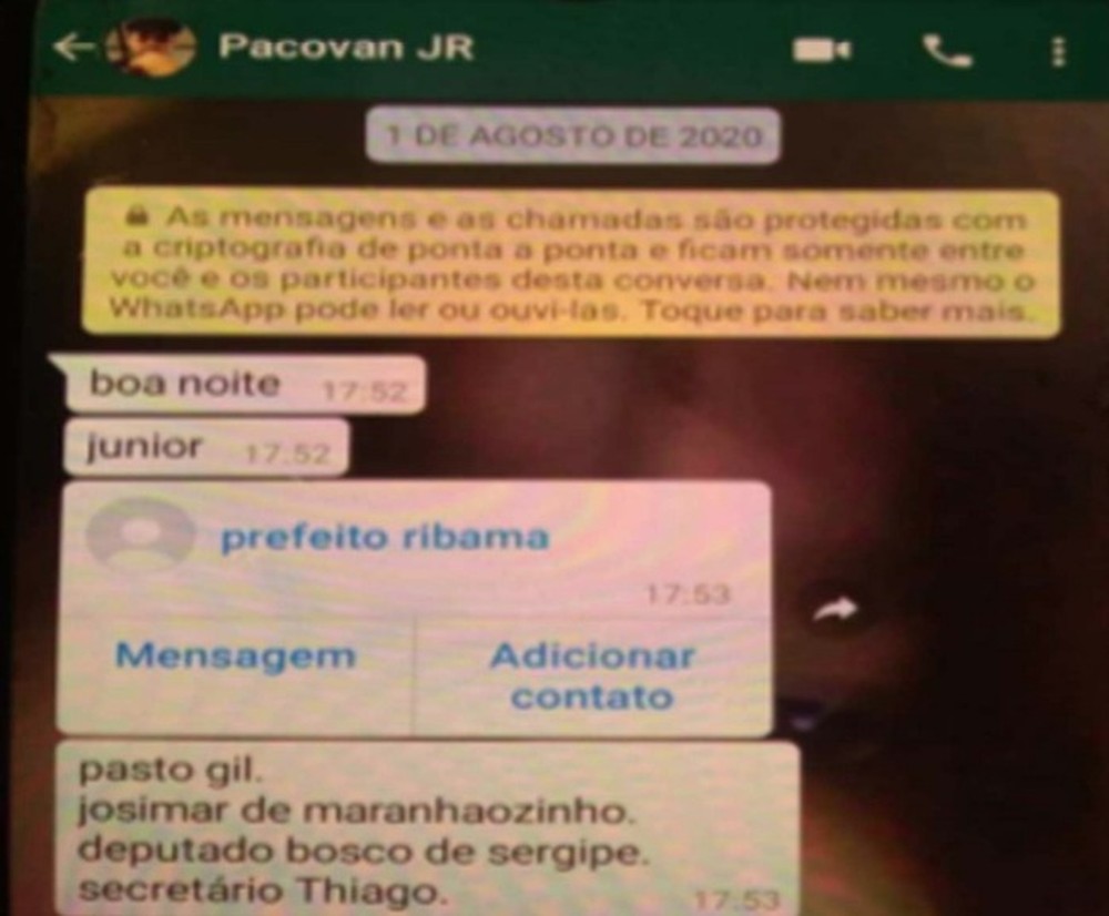 PRINT DA MENSAGEM – A imagem abaixo é um print de uma conversa de um agiota identificado como Pacovan JR. De acordo com a PF, a conversa mostra o agiota listando políticos e auxiliares que faziam parte do esquema. Para os policiais, os envolvidos podem ter cometido diversos crimes, como estelionato e extorsão, além de corrupção e associação criminosa.